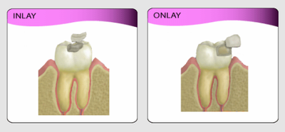 Dental inlays and onlays are restorations used to repair rear teeth with mild to moderate decay or cracked and fractured teeth that are not sufficiently damaged to need a crown. The new inlay or onlay is made from porcelain, gold or composite resin material. Inlays and onlays prolong tooth life and prevent the need for more dental treatment in the future.